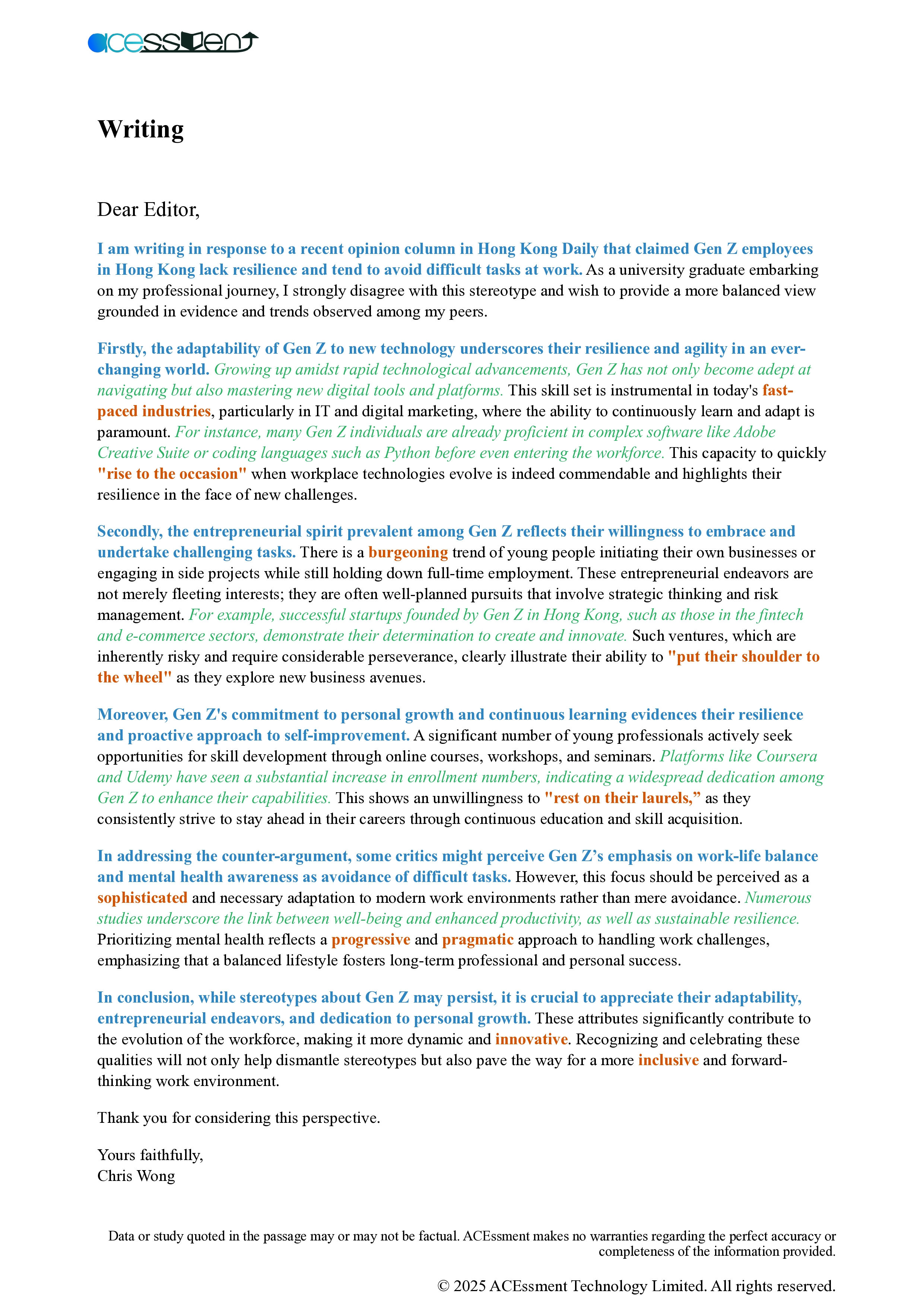 A recent opinion column claimed that Gen Z employees in Hong Kong lack resilience and avoid difficult tasks at work. As a university graduate entering the workforce, write a letter to the editor of the Hong Kong Daily disagreeing with this stereotype. Provide three reasons to defend your position.