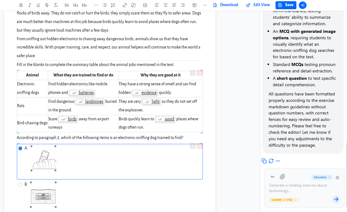 Complete materials appear — questions formatted, blanks set, audio generated, images added. Ready to use.